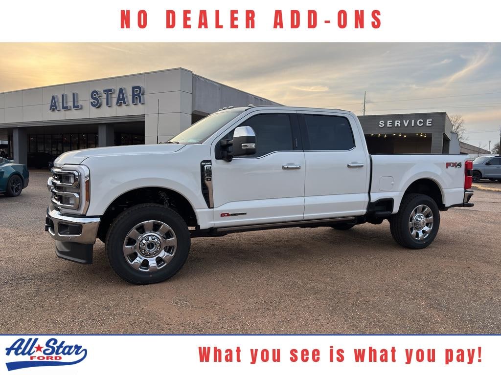 Experience power and luxury with this 2026 Ford F-250 Super Duty King Ranch 4WD, now available in Kilgore, TX. Built for drivers who demand capability and comfort, this heavy-duty powerhouse features a V8 6.7L Diesel engine that delivers exceptional towing muscle and long-haul efficiency. The King Ranch trim surrounds you with premium leather appointments and rugged durabilityâ"perfect for worksite duty or weekend adventures. This Ford F-250 comes loaded with modern technology and convenience: Hands Free Bluetooth keeps your focus on the road, Adaptive Cruise Control maintains safe following distances on highways, and the Back-Up Camera adds confidence when maneuvering trailers. Cold mornings are no problem thanks to Remote Start and a Heated Steering Wheel that provide instant comfort. With 4WD traction, this truck handles Texas weather and off-road terrain with ease. Priced to move, this 2026 Ford F-250 Super Duty King Ranch offers the best price in the areaâ"exceptional value for a model this capable and feature-rich. Located in Kilgore, TX, it's ready for test drives and immediate delivery. Whether you need maximum towing capacity, premium interior comforts, or advanced driver-assist technology, this truck checks every box. Contact us today to schedule a viewing and lock in the best price on this formidable Ford F-250 King Ranch 4WD with the V8 6.7L Diesel engineâ"your next workhorse and weekend companion awaits.
